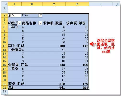 选取全部数据透视一区域,然后按del键