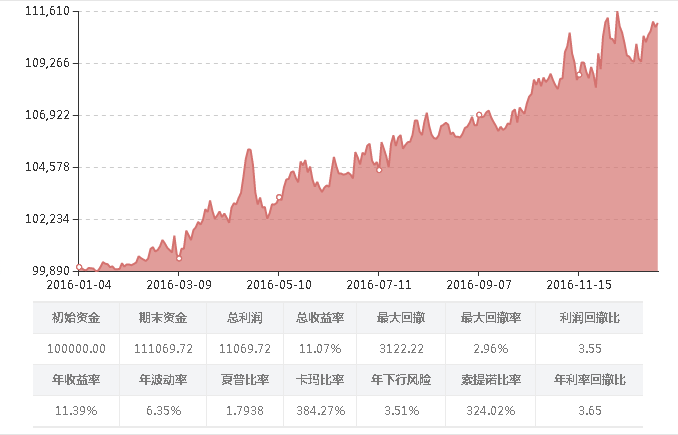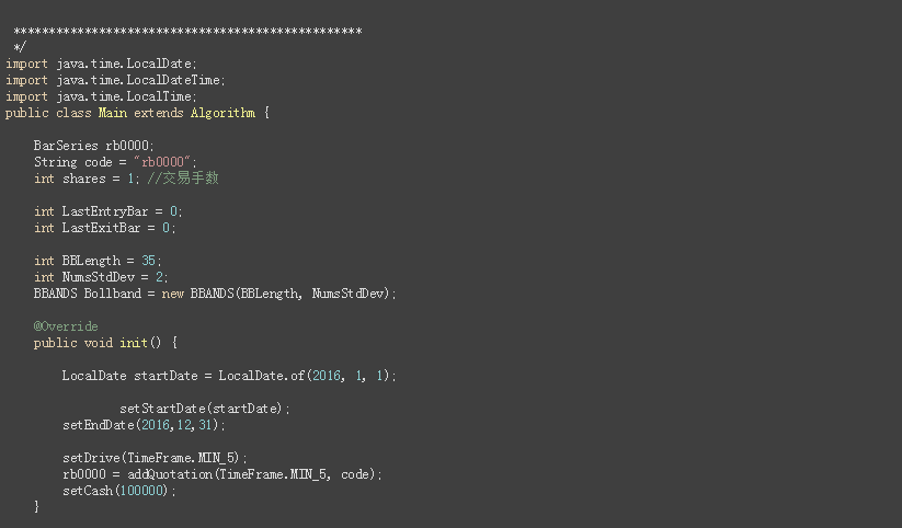 3、光行差也是基于布林线的交易系统,但是交易目标比布林强盗系统更加长期,因为可以采用两倍标准差通道,另外也不采用止损,用通道本身进行指标止损。我们用大宽网java语言编写代码,用2016年全年螺纹钢主力合约日线rb0000验证表现,主要参数使用35日布林线,两倍标准差,在不使用杠杆的情况下,结果如下: