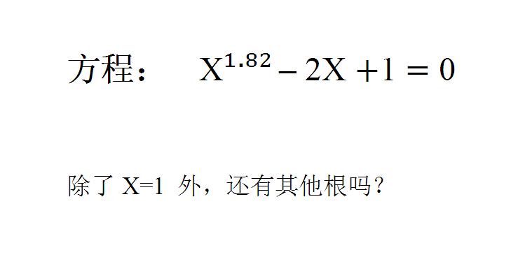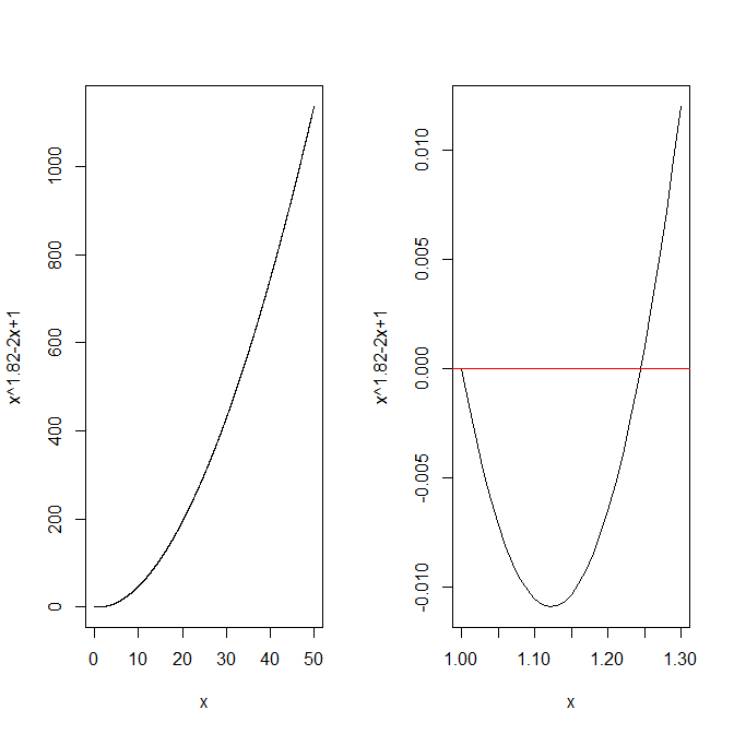 令y=f(x)=x^1.82-2x+1,對y對x微分可得,dy/dx=1.82x^0.82-2,令其為0,則可發現x*=1.121888,此點為臨界點,在此發生相對極小值。並未找出其他臨界點,即是說,除了此點外,方程式的幾何圖形不會再有轉折存在,所以,x的根只存在附近,因為x=1的時候為0,而x=1.121888為-0.01093,所以,一定存在兩個根。