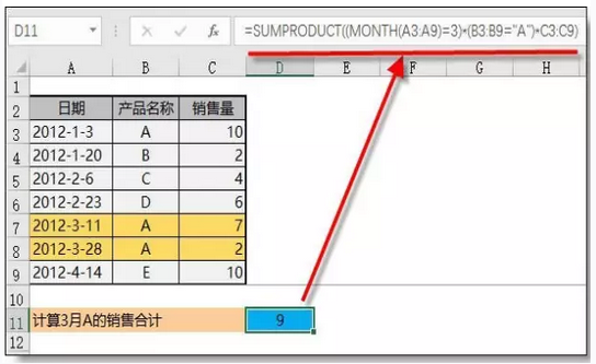 示例:统计A产品3月的销售合计