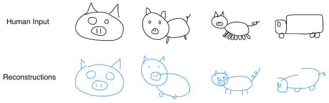 我们还想知道我们的模型是否可以学习多种动物的特征表现,如果可以,会是什么样子? 在下图中,我们通过在猫头和一只完整的猪之间插入潜在载体产生草图。 我们看到这个表现如何从猫头,一只尾巴猫到一只胖胖的身体的猫,慢慢地变成一只全猪。 像一个学习绘画动物的孩子一样,我们的模型通过将头,脚和尾巴附着在身上来学习建造动物。 我们看到,该模型还能够绘制与猪头不同的猫头。