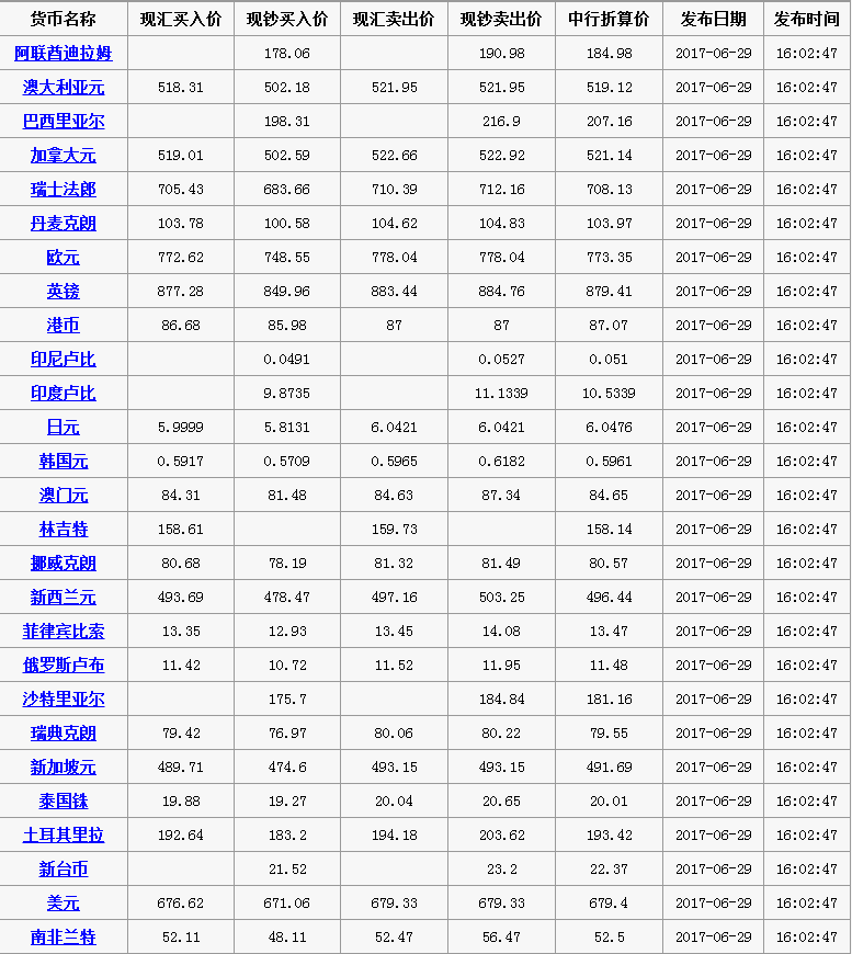 【2017年6月29日银行间外汇市场人民币汇率中间价】