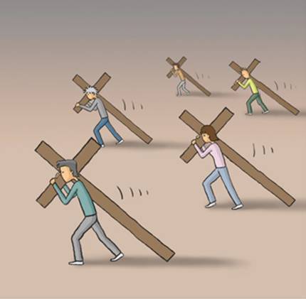 第一幅漫画中有许多的人,每个人都背负着一个沉重的十字架,在缓慢而艰难地朝着目的地前进。