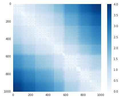 我们可以用像素图来描绘矩阵 D 中的内容,1000 个样本点中两两间的距离如下图所示: