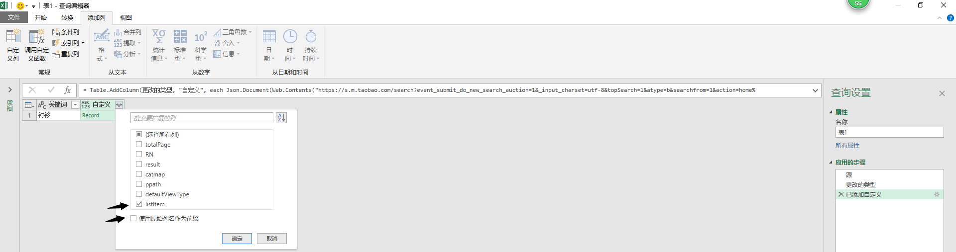 →仅勾选listItem,并把使用原始列名作为前缀前面的勾去掉→确定