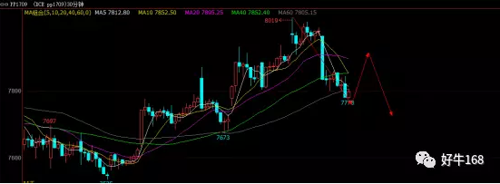 昨日PP1709合约低开低走跌破五日线支撑位,期价下方测试7700附近支撑,而之前的低点在7900一线,当价格跌破7900之后,这个位置就成为了一个强压力位,所以日内建议7900附近布局空单,止盈7700,止损7950。
