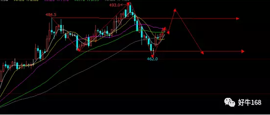 从铁矿石三十分钟技术图形上看,铁矿石形成的是在484.5至465之间的盘整之势,所以日内建议可以在484.5之上布局空单。早盘建议在486附近布局空单,止盈465,止损491.