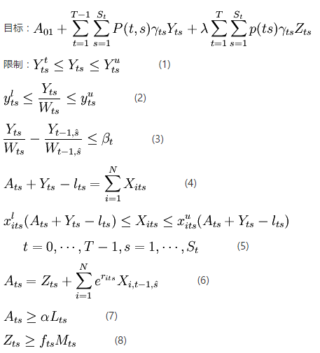 Dert在指定收益年金领域将该模型发展为多阶段机会限制模型(Multistage chance-constrained ALM model),与Charnes和Kirby不同的是,该作者以场景模拟不确定性而不是作分布假设。以该模型为例,该这个模型的目标函数是,在失去偿付能力的风险水平可以接受、确保及时支付指定收益的能力的稳定性的限制下实现筹资成本最小。其中偿付能力要求为基金剩余负债与相应偿付能力比率的乘积(即下述模型限制7),资产价值低于要求的水平通过场景设定模拟(限制8、9、10)。