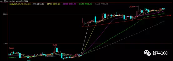 豆粕三十分钟级别里面在高位震荡,呈现震荡上行之势,那么之前的跳空高开点位,也就是我们的震荡低点。所以今日早间依旧可以选择回撤趋势线尝试一次多单,建议在2800附近,止盈2830,止损2780。