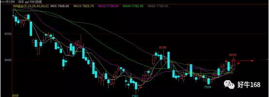 昨日PP1709合约低开后随后快速的拉升,至收盘时已经突破至6月1日来的高点了,且日线级别MACD动能红柱也开始放量,后期建议以点位做多为主,今日建议关注日线图五日均线位置,可以的在7980附近布局多单,止盈8050,止损7930。