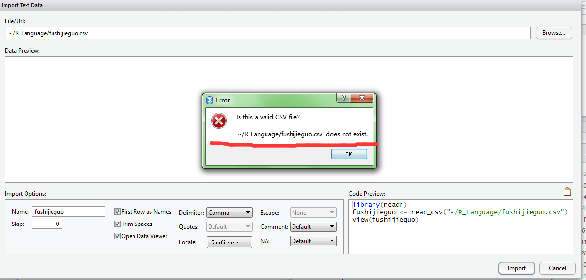 (2)这是使用import datasets时的错误,提示文件不有效,但是如果在命令窗口使用read.csv()函数时可以正常使用。