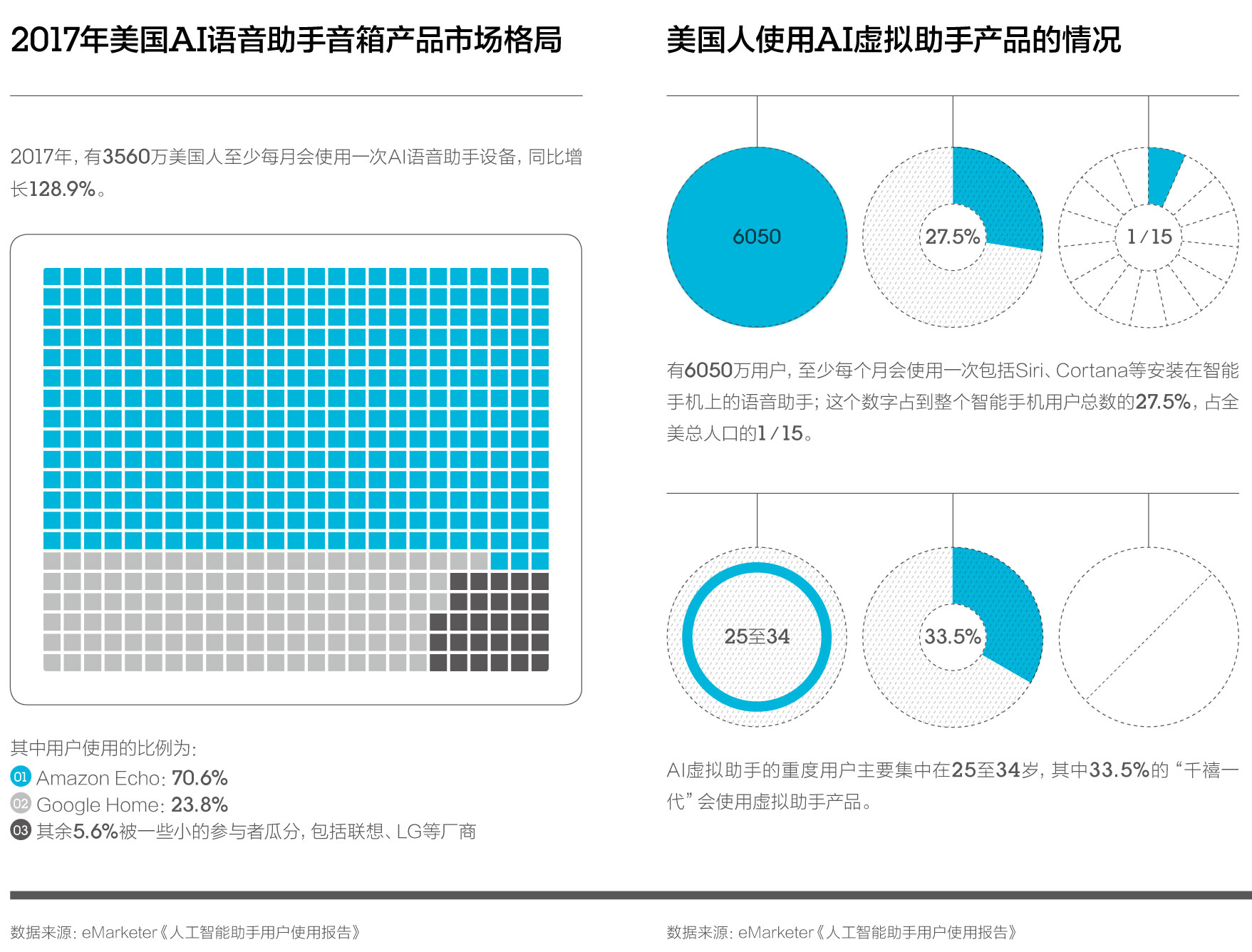 市场调研公司eMarketer在2017年4月发布的报告指出,2017年有3560万美国人至少每个月会使用一次人工智能语音助手设备,比2016年增长128.9%。这份报告还指出,在智能语音外设硬件产品中,AmazonEcho以70.6%的市场份额,占据绝对优势;其次是Google在2016年推出的同类产品GoogleHome,目前在美国市场占有率为23.8%;其余的5.6%被包括LG、联想等其他硬件厂商瓜分。尽管早在若干年前,技术公司们都已经意识到,智能语音互动将会是下一代技术产品最核心的用户入口,但是从手机到手表,再到其他各种加载语音交互功能的可穿戴设备或者影音硬件,似乎都没有真正打中用户的需求要害,显得不得其法。