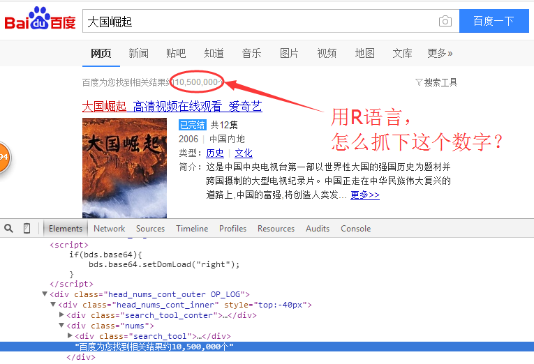 web<-read_html("http://www.baidu.com/s?wd=大国崛起",encoding="UTF-8")