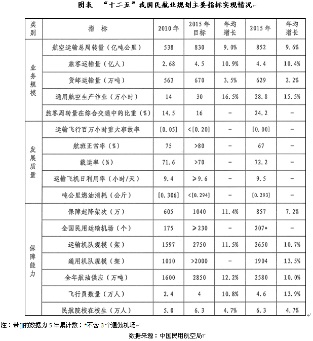 国务院出台《关于促进民航业发展的若干意见》,明确民航重要战略产业地位。航空运输在综合交通运输体系中的地位不断提升,2015年民航旅客运输周转量在综合交通体系中所占比重接近1/4。民航业与区域经济融合发展进程加快,临空经济成为推动地区转变发展方式新亮点。民航国际影响力逐步扩大。