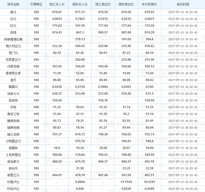 【2017年7月13日银行间外汇市场人民币汇率中间价】