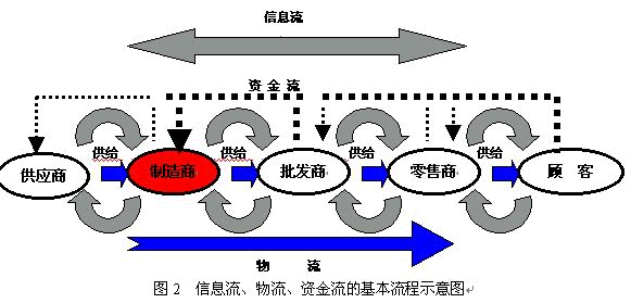 安东尼等通过对于以组装加工业务为主的制造型企业进行大量的观察分析发现,其管理系统业务流程包括了物流、资金流和信息流的双向流动及其基本规律。首先,物流的流程一般体现在从采购部件到产品销售出去的整个过程之中,是自上游向下游方向流动,先从供应商流到企业,再到批发商、零售商和顾客,即企业需要经过零部件采购、调拨、生产加工、发送、销售等业务流程,同时,在企业进行上述调拨或采购零部件流程之前,零部件制造商及原材料加工商等供应商也在进行销售活动;在企业进行销售活动之前,批发商和零售商也在进行采购活动。而资金流的流程与物流相反,是从下游向上游方向流动,即从顾客流到零售及批发商,然后到企业(或直接到企业),再流到供应商。再者,信息流与物流、资金流等相比较,其流动过程要复杂得多。企业信息主要包括订货信息、发货信息、收支信息等,信息流在与物流、资金流互补的同时,又起着管理企业整体活动的作用。不难看出,其实安东尼所描述的正是一幅供应链全景图。