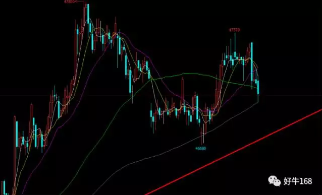 从小时图来看,价格先跌破颈线,后反抽高点不破再度大幅下行,多空交战已经决出胜负,目前来看上升趋势线位置也很难阻挡价格的下跌之路,价格有大跌迹象。反抽47100附近做空,止损于47160附近,止盈于46700附近。同时在46650附近可以抢个小反弹,止损于46650,止盈于46800附近,多单只建议做一次。