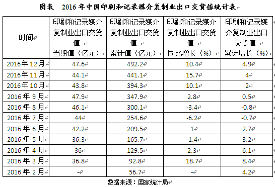 2016年12月中国印刷和记录媒介复制业出口交货值47.6亿元,同比增长10.4%;2016年1-12月中国印刷和记录媒介复制业出口交货值492.2亿元,同比增长4.9%。