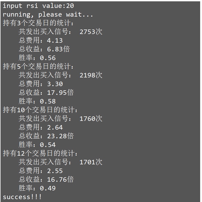 从统计结果我们看到当RSI小于20时,持有10个交易日总收益高达23倍,而我们的时间跨度仅仅为1年半。