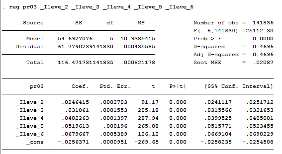 用的xi命令,自变量是5个分类的虚拟变量,没有其他自变量了。此时常数项代表基准组对Y的影响吗?那我这个结果里只有常数项系数为负数,是不是代表基准组对Y的影响和别的相反呢?