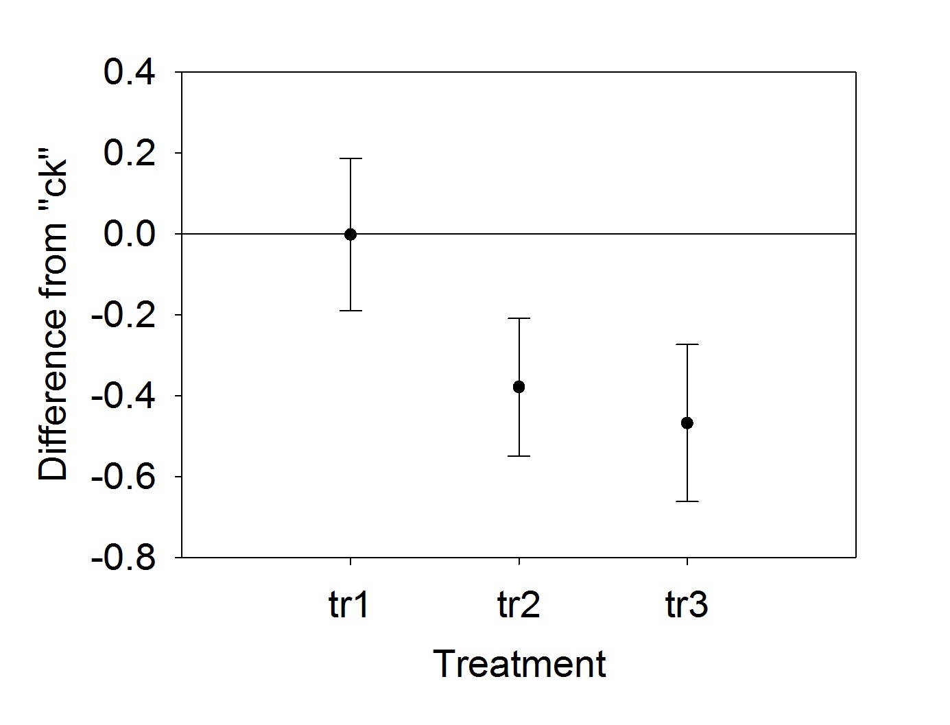 小弟的试验中,响应变量是RB,固定因素是treatment(四个水平为ck tr1 tr2 tr3),随机因素是year和block。我想分别比较ck和tr1 tr2 tr3的差异,即不关注tr1 tr2 tr3 三者之间的差异。