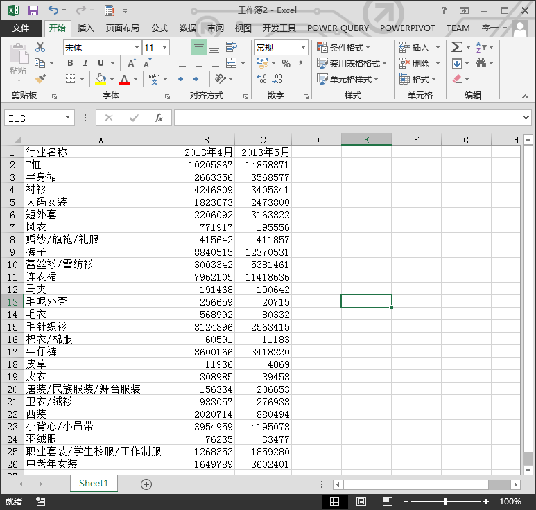 先给出波士顿矩阵的定义 : 波士顿矩阵(BCG Matrix: Boston Consulting Group),又被称为市场增长率-相对市场份额 矩阵、波士顿咨询集团法、四象限分析法、产品系列结构管理法等,它是由美国著名的管理学 家、波士顿咨询公司创始人布鲁斯亨德森于 1970 年首创的一种用来分析和规划企业产品组合的 方法。同时,如何将企业有限的资源有效地分配到合理的产品结构中去,以保证企业的收益, 是企业在激烈的竞争中能否取胜的关键。 下面结合实例进行讲解。 下图是 2013 年 4 月和 5 月女装类目的数据。