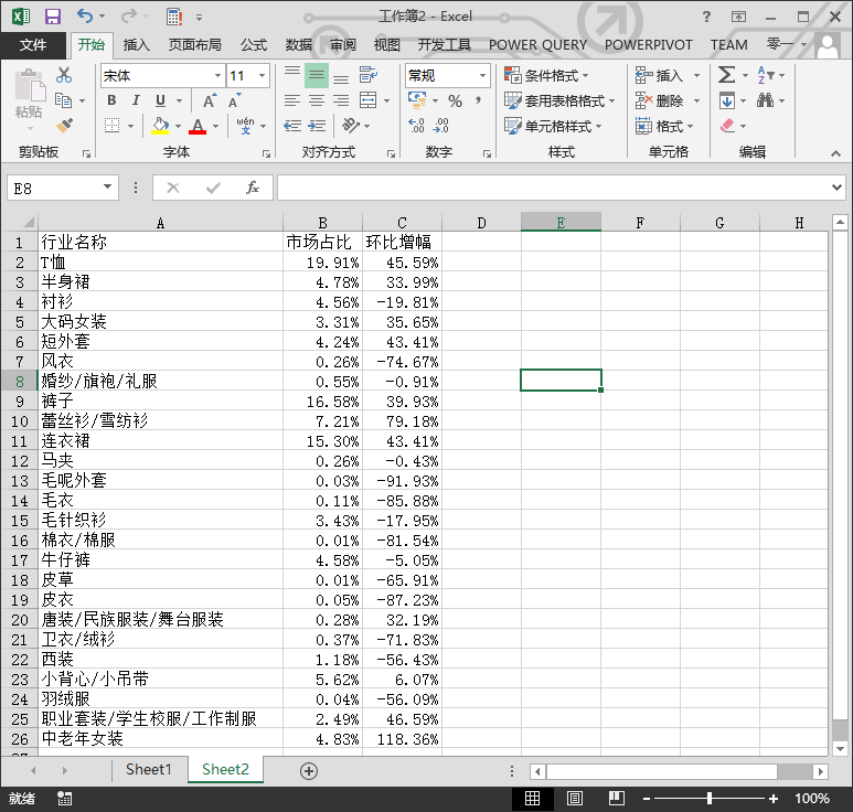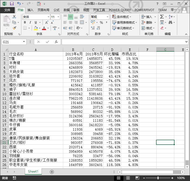 下面要先计算出两个数据,即5月的环比增幅和5月的市场相对占比。环比增幅不用说了, 市场相对占比就是各个子行业的销量在整个大行业所占的百分比,如下图所示。