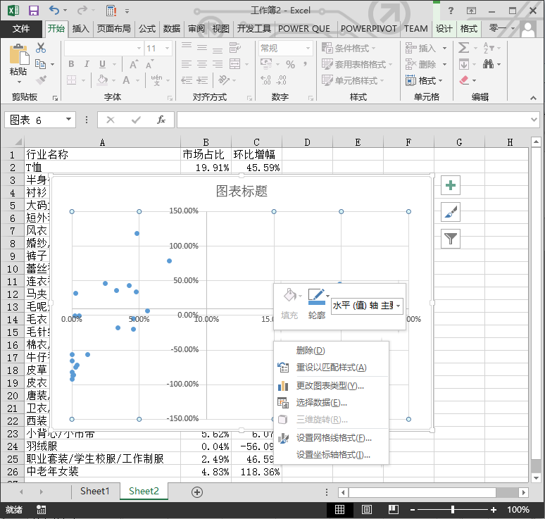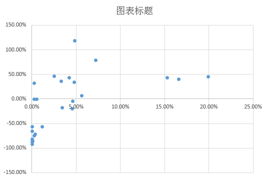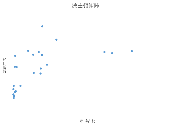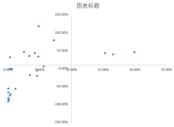 插入散点图后的效果如下图所示,其中的两列数据必须要这么排放位置,即市场占比作为 X 轴,环比增幅作为 Y 轴。