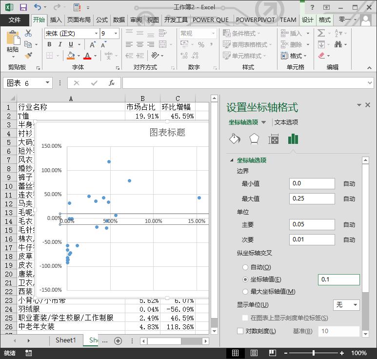 同理,设置纵坐标交叉的坐标轴值为 0.1(10%),如下图所示。