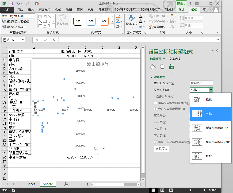 设置坐标轴标题格式,将纵坐标轴标题的文字方向改成竖排,如下图所示。