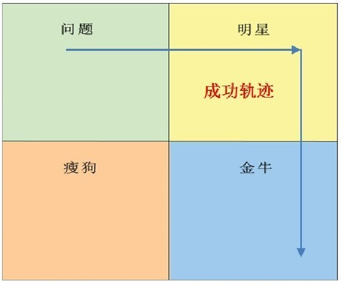 下面是成功商品的成长轨迹,也是比较理想的商品成长路线。在高增长率下,市场占有率 会逐渐上升,终落入金牛区,如下图所示。