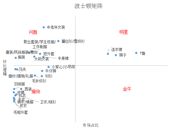 解读一下这里的信息:【明星】区的连衣裙、裤子和 T 恤衫是当季的旺品,增幅和份 额都很大;【瘦狗】区的是还未入季的品类;【问题】区就比较复杂,其中是高增幅,低占比的 品类,可能是即将入季的品类,也可能是品类本身的市场份额就小,如下图所示。