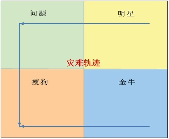下图是灾难轨迹,其中有两条路线,一条是明星→ 问题→ 瘦狗,另一条是金牛→ 瘦狗, 这两条轨迹就是市场逐渐萎缩的过程。