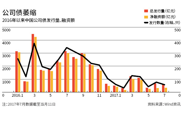 据财新记者了解,自去年开始,交易所债市已经在有意控制规模。Wind数据显示,2016年11月之前公司债单月总发行量在2000亿元上下,甚至有的月份达到4473亿元;但自2016年12月开始,公司债单月发行量骤减——2016年12月至2017年6月平均单月发行量仅为684.39亿元。