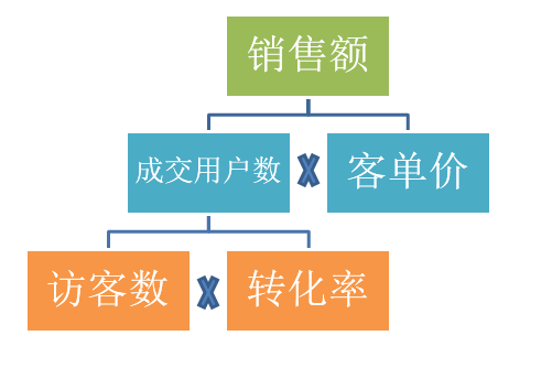 销售额=成交用户数*客单价,成交用户数又等于访客数*转化率。