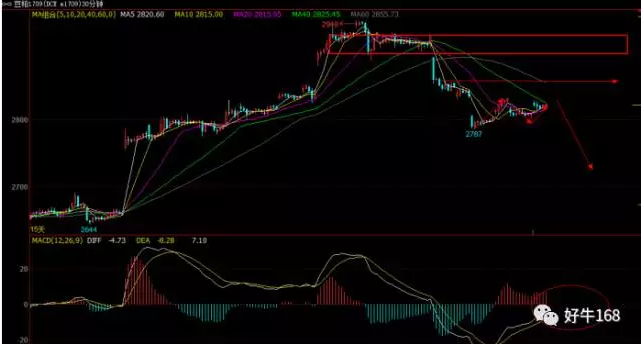 从三十分钟图来看,豆粕多头主力已经出逃,上方2900以上的多单形成被套,那么从MACD指标当中也可以看到快慢线现在均运行在零轴下方,价格出去非常弱势的阶段,当它消化掉了最后的多头之后,笔者认为可以去布局空单,整体价格应该在2865以下的压制。日内建议2842布局空单,止损2865,止盈2800。
