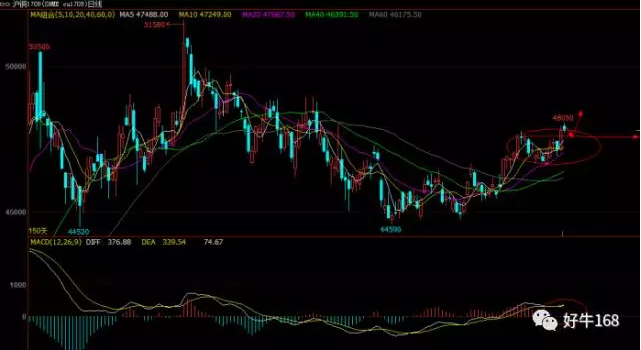 从日线图来看,价格跌至下方二十日均线位附近得到了支撑,MACD指标当中的快慢线在零轴上方运行,整体运行是较强势的,且昨日所提到的关注重点前期高点已经突破,那么日内以回撤做多为主,47650附近布局多单,止损47600,止盈47800。