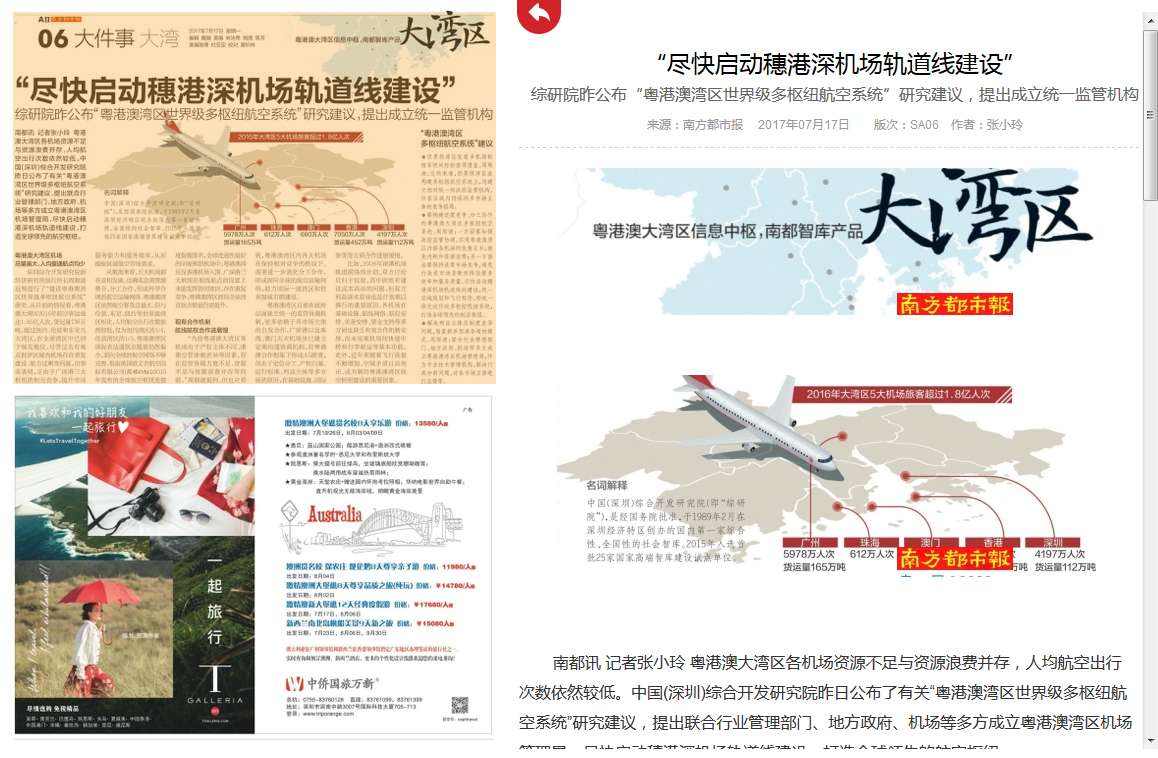粤港澳大湾区各机场资源不足与资源浪费并存,人均航空出行次数依然较低。中国(深圳)综合开发研究院16日公布了有关“粤港澳湾区世界级多枢纽航空系统”研究建议,提出联合行业管理部门、地方政府、机场等多方成立粤港澳湾区机场管理局,尽快启动穗港深机场轨道线建设,打造全球领先的航空枢纽。