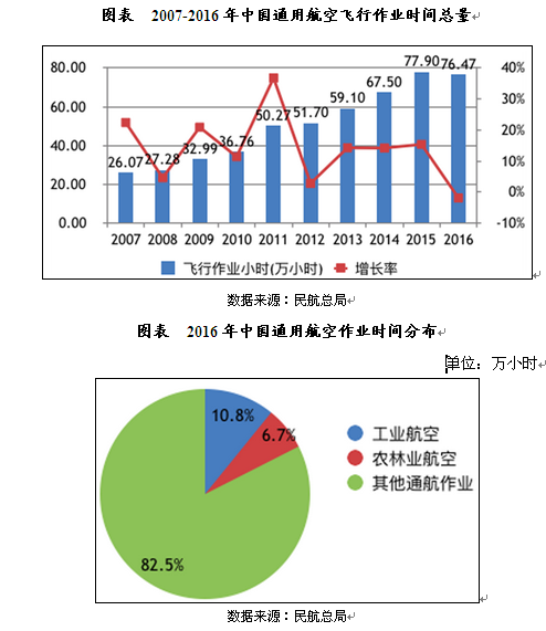 中投顾问发布的《2017-2021年中国通用航空行业深度调研及投资前景预测报告》数据显示,2016年,全国通用航空行业完成通用航空生产作业飞行76.47万小时,比上年降低1.8%。其中,工业航空作业完成8.29万小时,占作业总量的10.8%;农林业航空作业完成5.10万小时,占作业总量的6.7%;其他通用航空飞行63.08万小时。