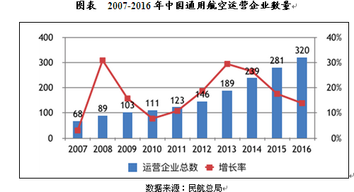 截至2016年底,中国拥有获得通用航空经营许可证的通用航空企业320家,比上年增长13.9%。其中,拥有实际作业量的企业224家,拥有91部H章运营许可企业201家,拥有91部K章运营许可的企业32家,拥有135部运营许可的企业46家。