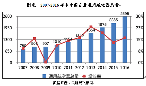 中投顾问发布的《2017-2021年中国通用航空行业深度调研及投资前景预测报告》数据显示:截至2016年底,中国通用航空机队在册总数为2595架(具),比上年增长16.1%。其中,固定翼飞机1705架(包含商务机264架),旋翼机825架,气球61架,飞艇4架。