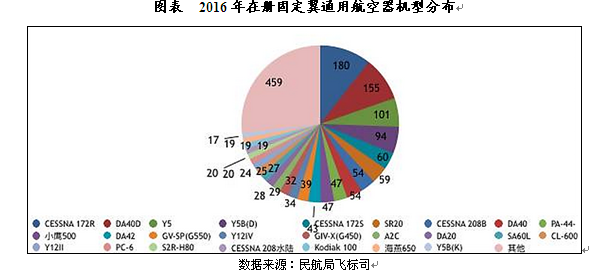 截至2016年底,中国通用航空数量前三位的固定翼机型为CESSNA172R、DA40D、Y5,分别为180架、155架、101架。