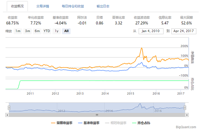 以下为回测结果。回测时间为2010年年初到2017年4月,总收益68.75%,年化收益率为7.72%,是银行理财收益的2-3倍了,策略Sharpe值达到了3.32,已经算比较不错的策略了,最大回撤主要发生在15年股灾期间,因此该策略最大的风险为股灾,当市场出现崩盘的时候,该策略会失效,因此使用该策略实盘一定注意股灾,如果判断股灾来临,立马止损清仓,待市场企稳后再启动该策略,当然这样的话,因为减少了股灾期间的损失,年化收益肯定比7.72%要高出一部分了。