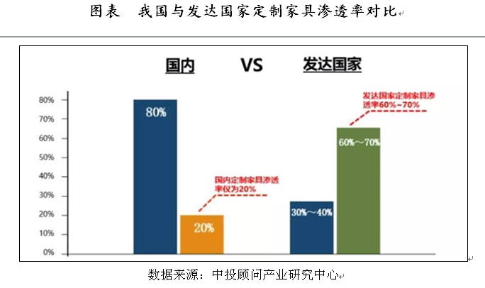 中投顾问发布的《2017-2021年中国定制家具行业深度调研及投资前景预测报告》表示,分品类看,定制家具品类主要集中在定制橱柜和衣柜,其中前者的渗透率约为60%、后者渗透率约30%,这主要是因为厨房、卧室布局差异性大,消费者对提高空间利用率需求迫切,且定制橱柜和衣柜由国外引入的时间也比较早所致。预计未来定制橱柜和衣柜的渗透率仍将不断提高,根据测算,目前定制橱柜终端市场规模约1000亿元,预计未来将以15%左右复合速度增长;定制衣柜的终端市场规模为500亿元,预计以约20%复合增速增长。