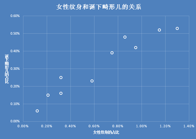 调查人员发现多个社区中,这个妈妈纹身的占比越高,这个社区出现畸形儿的概率就越高。那调查人员就很费解了,纹身跟生BB有什么关系呢?后来针对这些纹身妈咪做了调查,结果如下
