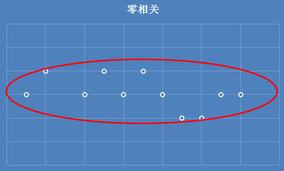 接着是零相关,只要是呈现下图这种趋势的分布,就称之为零相关。表示维度之间没有什么相关性。