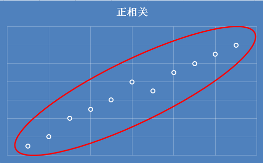 首先是正相关,只要是呈现下图这种趋势的分布,就称之为正相关,表示任意一个维度增长,另一个就跟着增长,反之,下降就随之下降。