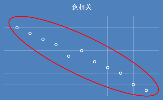 最后是负相关,只要是呈现下图这种趋势的分布,就称之为负相关。表示任意一个维度增长,另一个就下降,反之,下降就随之增长。