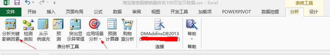 然后再表格工具里面有个分析(必须要有安装了数据挖掘套件才能有这个)