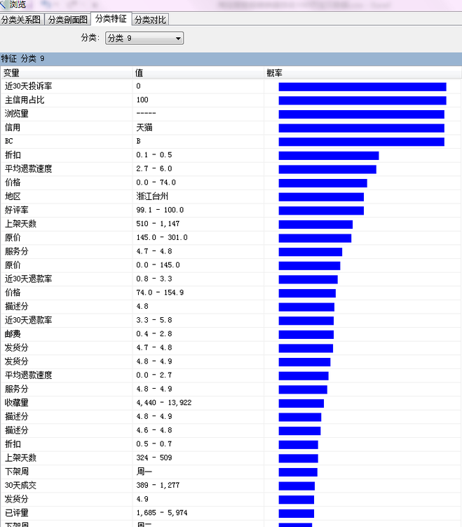 主要特征是:无投诉,主营100%,天猫店,退款速度2.7-6.0等,大家可以看下。下一篇会跟大家详细介绍聚类。